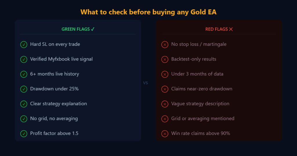 A trustworthy Gold EA should have a verified live account (not demo) running for at least 6–12 months, hard stop losses on every single trade, a profit factor above 1.3, and a maximum drawdown under 25%.