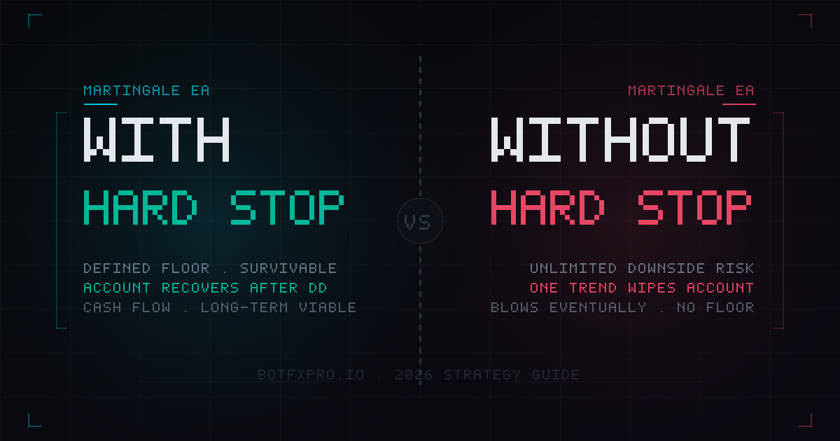 Every martingale EA on BotFXPro carries a hard portfolio stop loss. This is not optional or configurable — it’s a structural requirement.
